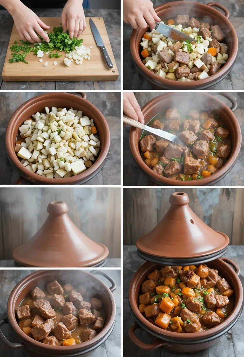 After the initial cooking period, add carrots, potatoes, and halved apricots to the pot. These ingredients need less cooking time than the beef and will maintain their shape and texture when added later. Stir gently to distribute evenly throughout the tagine.