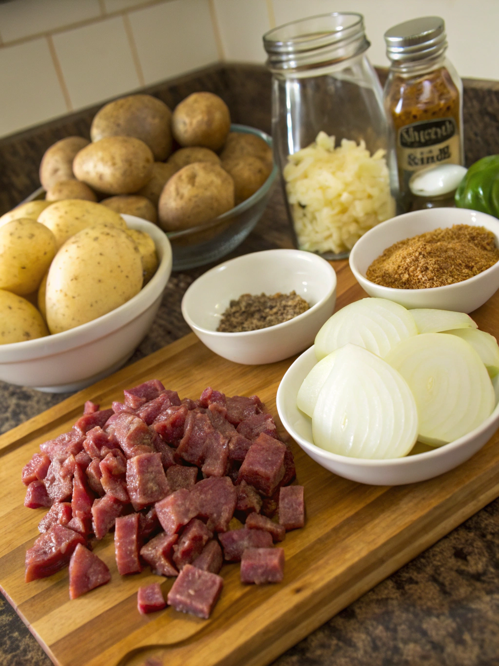 Dice the potatoes, onion, and corned beef into small, uniform pieces. Mince the garlic and chop the parsley (if using).