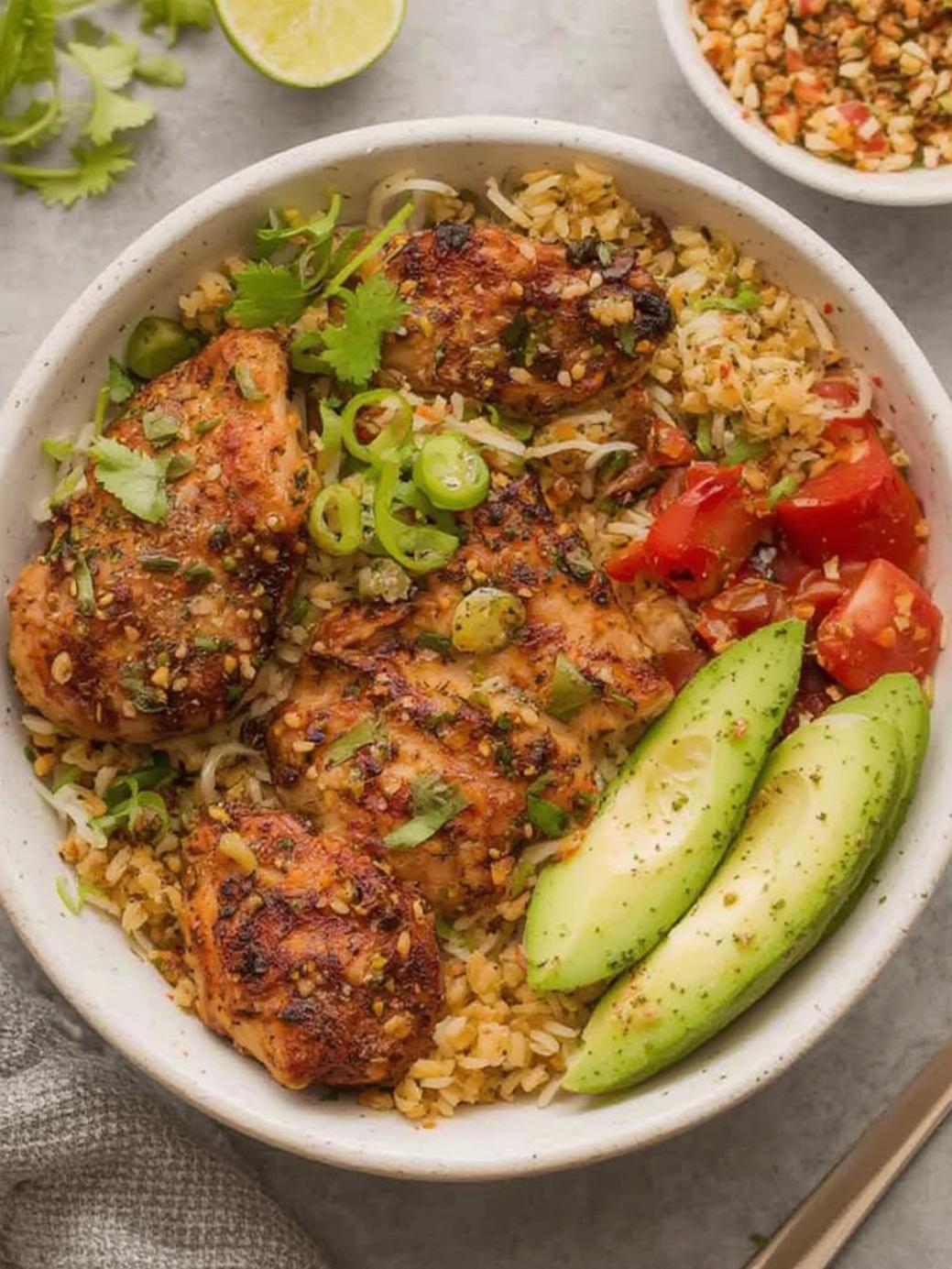 6. Assemble your Simple Air Fryer Chicken Bowl: Place the cooked chicken over the rice, then arrange mixed vegetables, avocado slices, cherry tomatoes, and red onion around the chicken. This balanced arrangement makes your air fryer recipes both visually appealing and properly portioned.